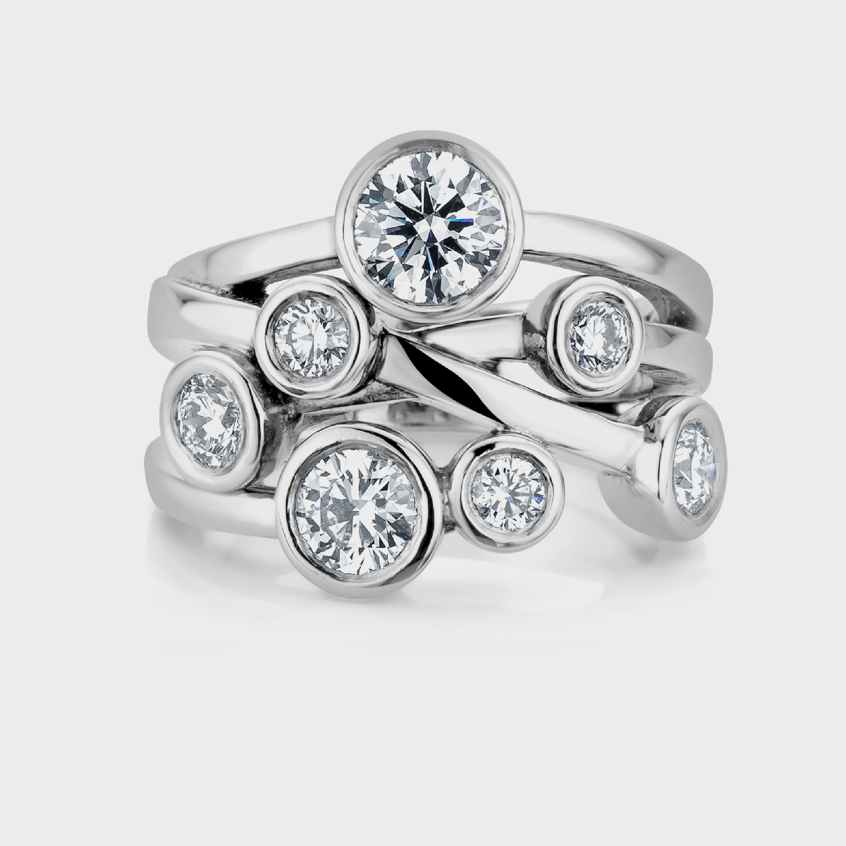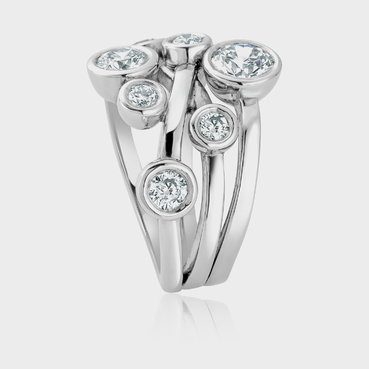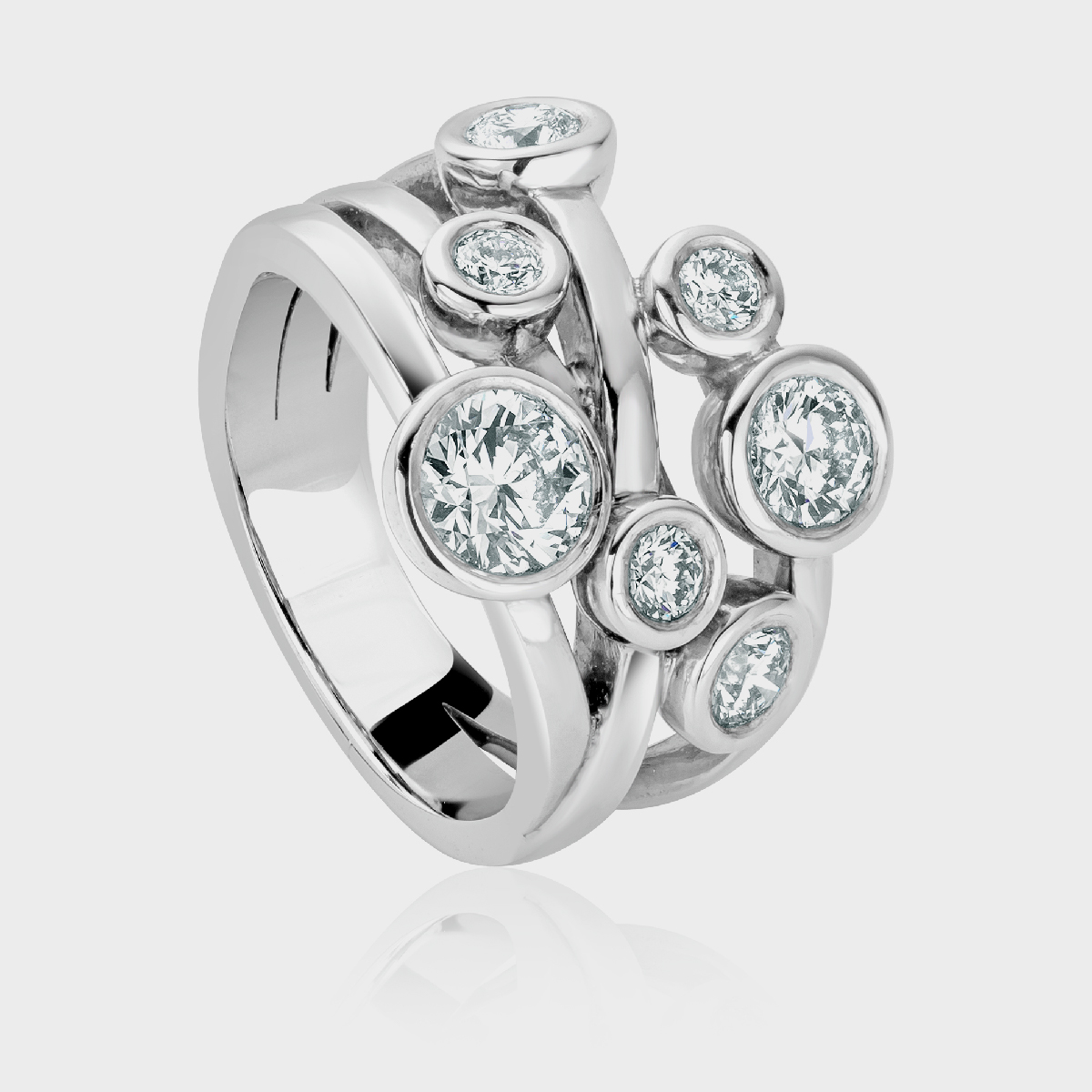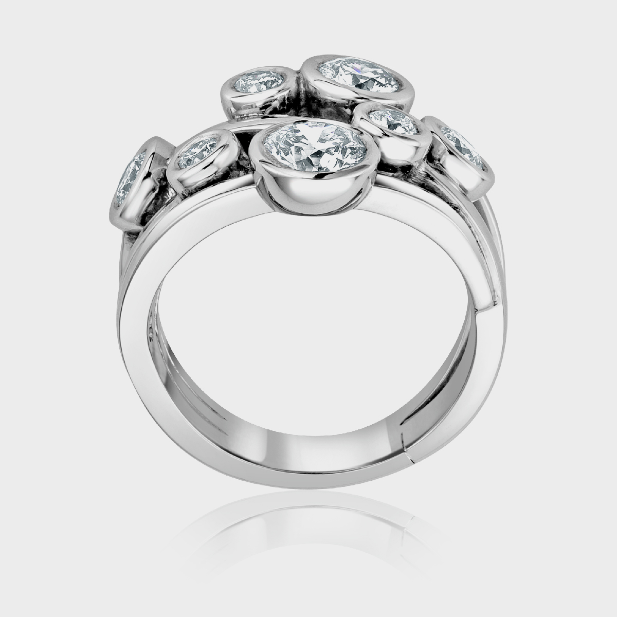 A variant of a classic design. A random scatter of 7 brilliant cut diamonds – beautifully balanced yet strangely arresting.